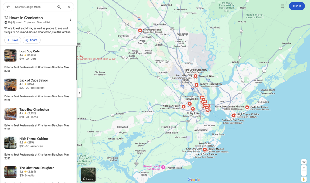 A highly curated list in Google Maps of places to eat and drink, and things to see and do, in Charleston, South Carolina.