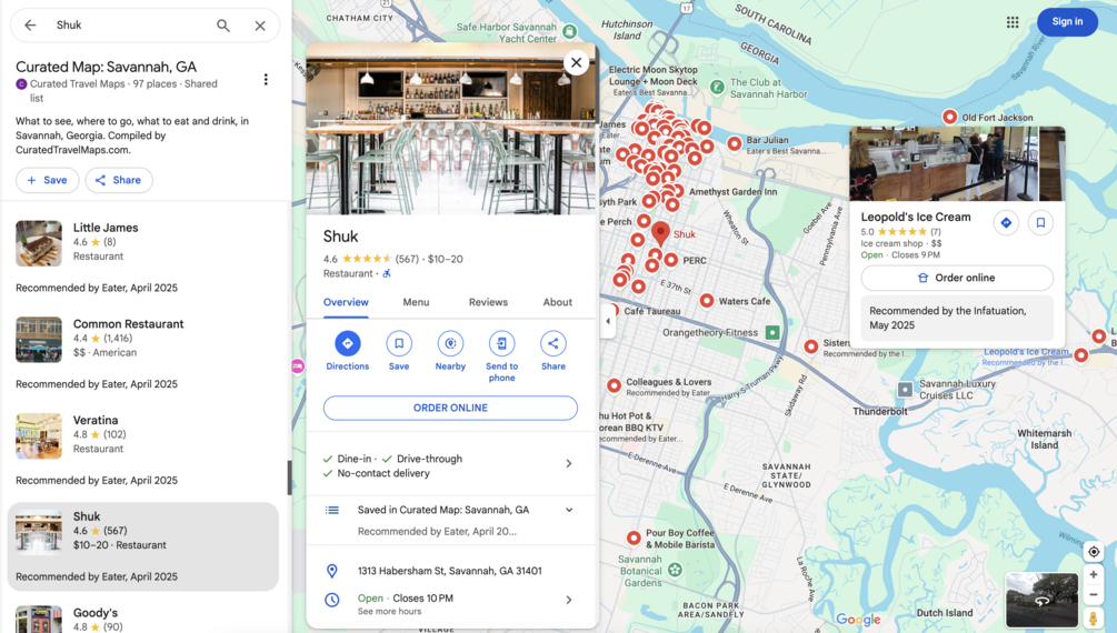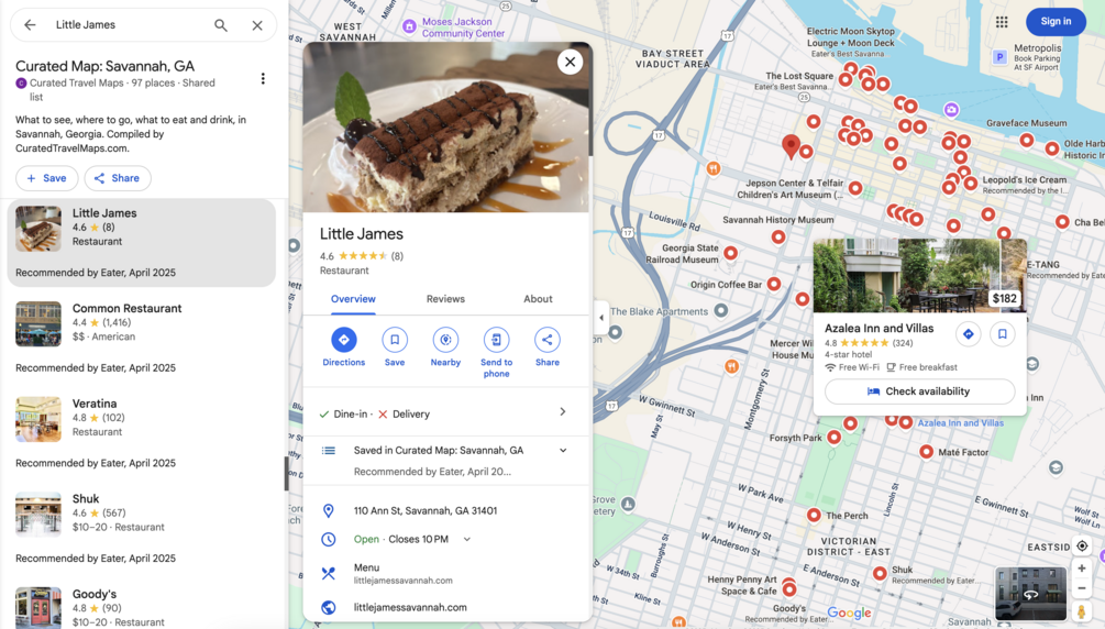 A highly curated list in Google Maps of places to eat and drink, and things to see and do, in Savannah, Georgia.